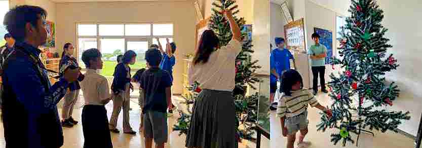 座間味村では、年に1回「テーブルマナー給食」があります。子供たちは、ナイフとフォ-ク、スプーンを使って洋食の食べ方に挑戦します。クリスマスの雰囲気の中、おしゃれな給食でした。