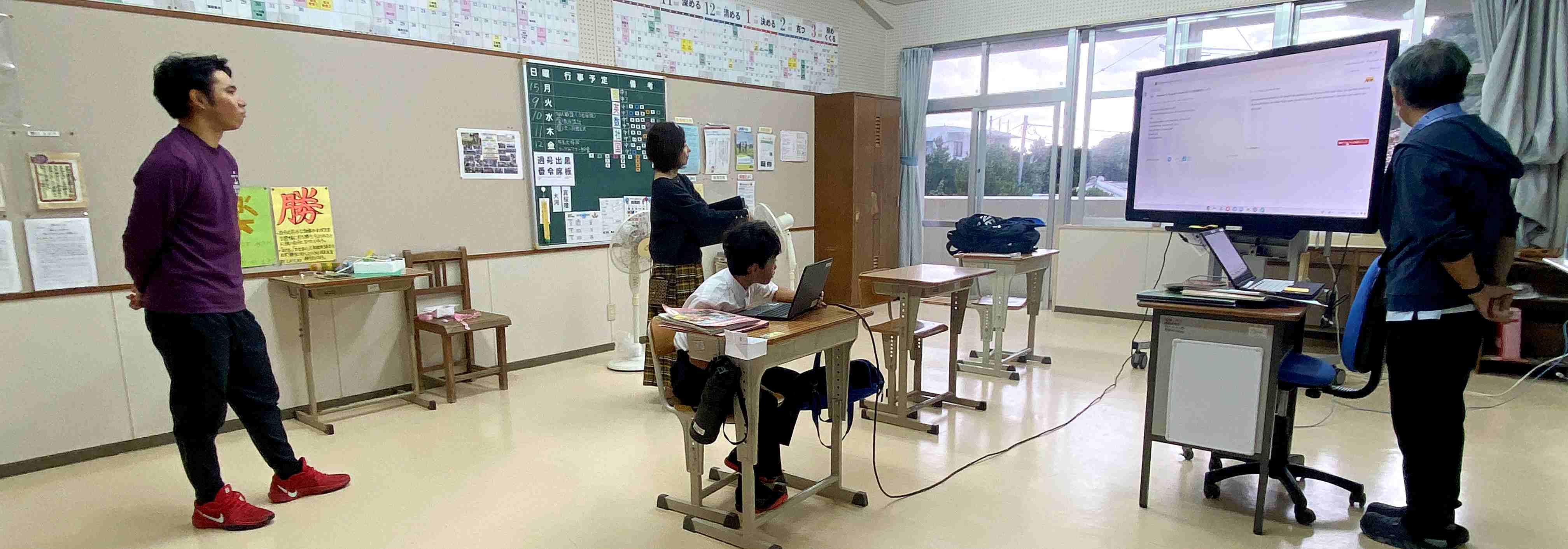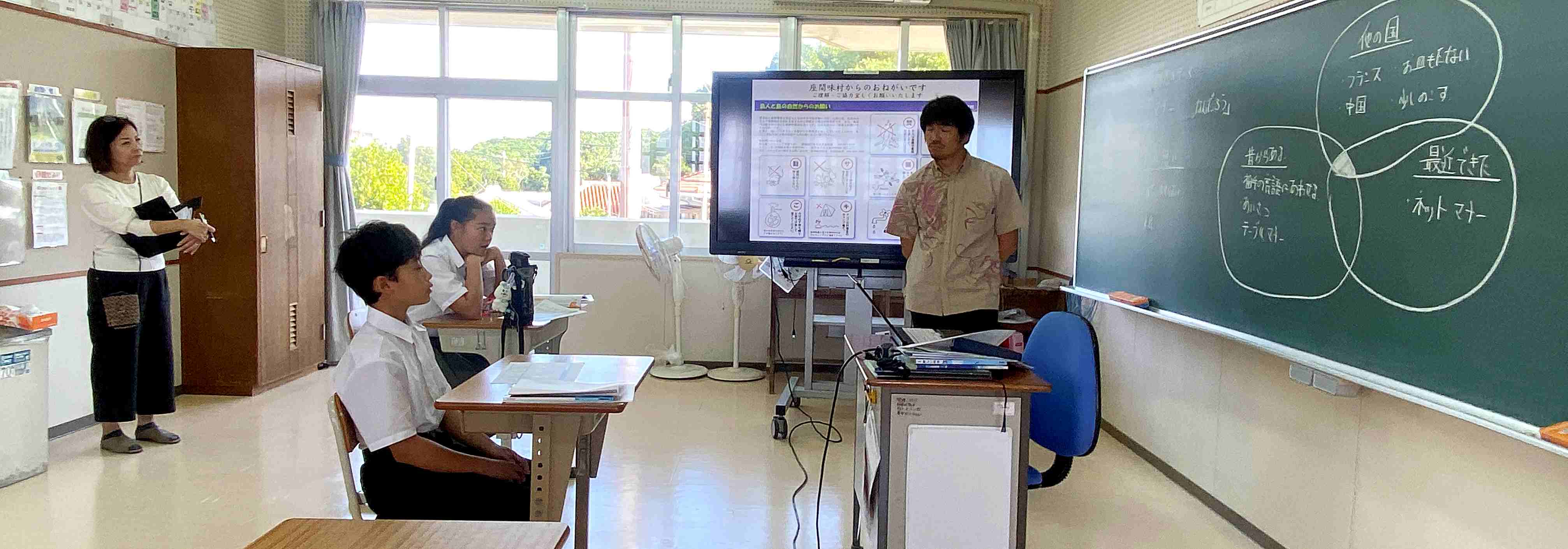中学部では、座間味村の3校がオンラインでつながりディベートの合同学習を行いました。離れた場所にいても画面を通して互いの意見を交わし合う学習ができました。