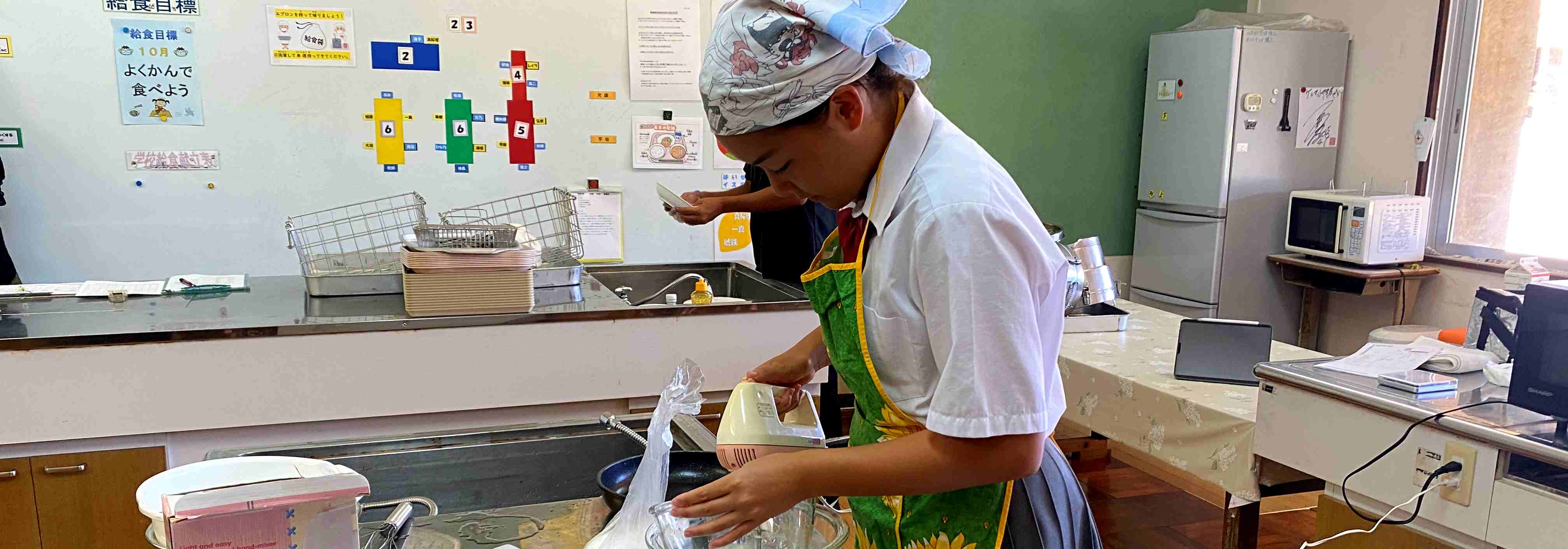 中学3年生は調理実習でお菓子作りに挑戦しました。卵白と砂糖を上手に泡立て、人参やほうれん草などのペーストを混ぜ込んで丸めていきます。2時間でとても美味しい「たまごボーロ」が完成しました。
