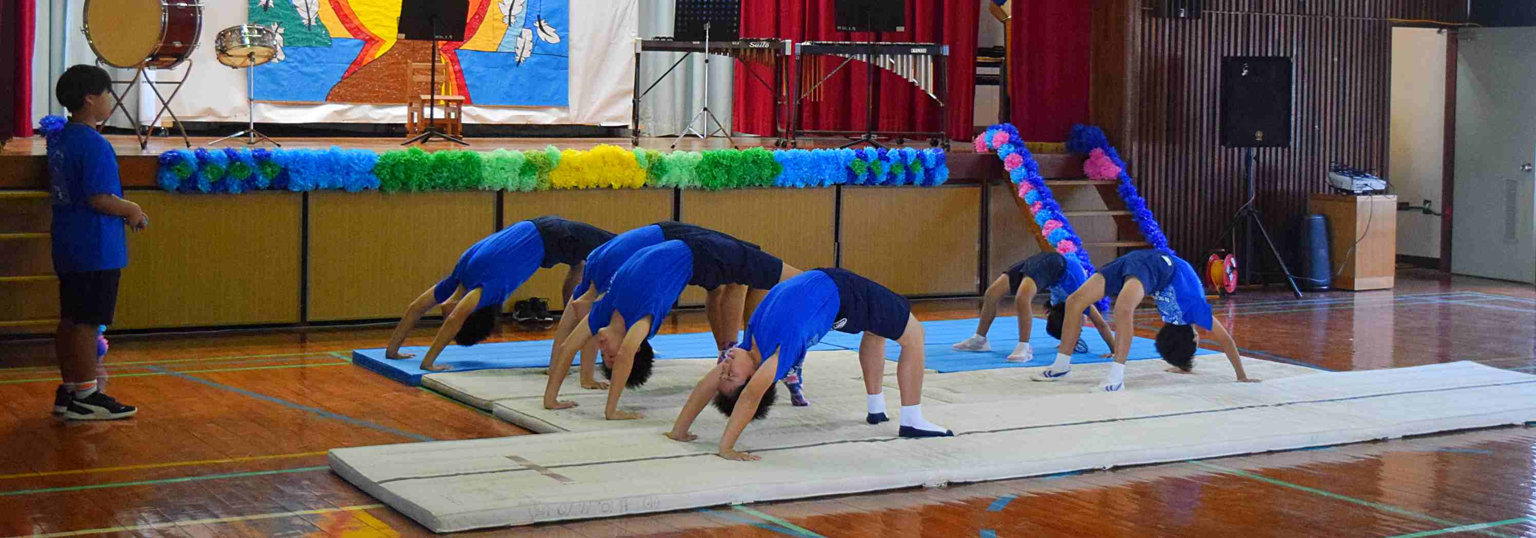 今日は学習発表会です。小学生は体育の時間に話し合ったり練習したりした「シンクロマット」を披露しました。複数の動きをつなげた一連の技は、お互いにサポートしながらカッコよく仕上がっていました。
