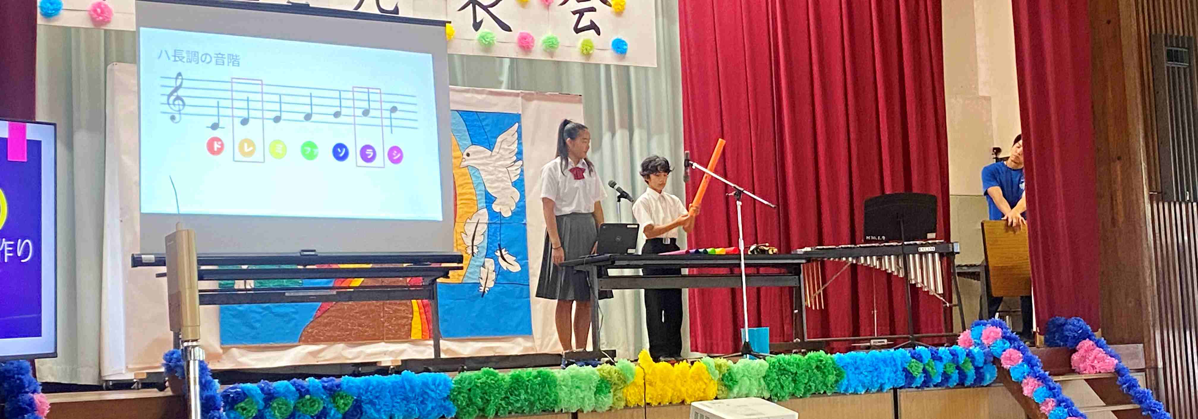 中学生は、音楽の授業でやった曲作りを発表しました。1年生は「ヨナ抜き音階」3年生は「琉球音階」について紹介し、鉄琴と三線を使った演奏では音色が体育館に広がり、来場者の心を魅了しました。