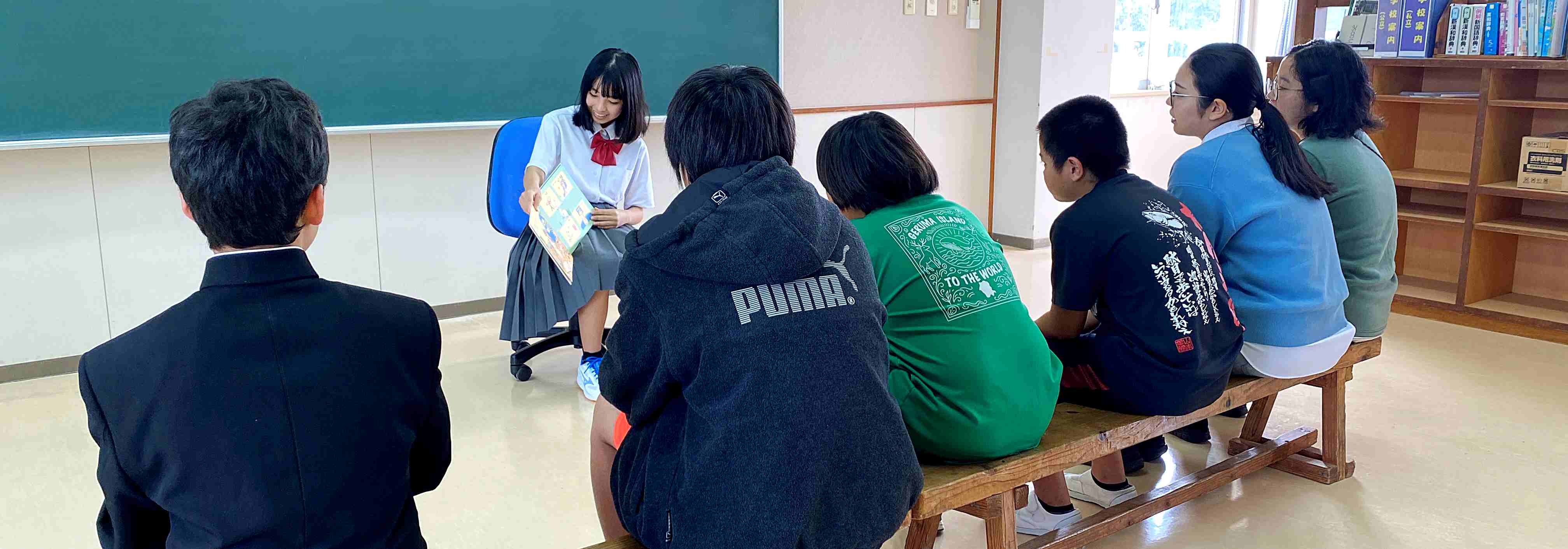 中学1年生の奥原さんによる読み聞かせがありました。読んだ本は、「バムとケロのにちようび」です。雨の日を楽しく過ごそうと考えたバムの行動が面白いです。ぜひ、読んでみてください。